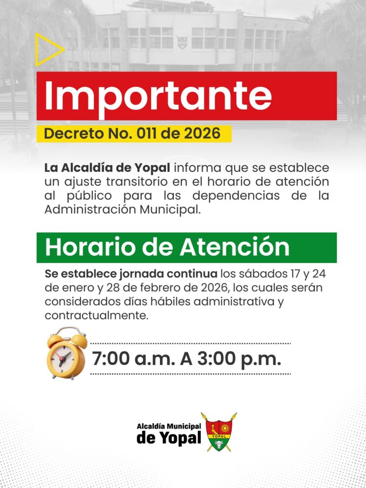 De acuerdo con la Administración Municipal, los sábados 17 y 24 de enero y 28 de febrero de 2026 fueron declarados como días hábiles, tanto administrativa como contractualmente. Esta medida permitirá avanzar en trámites y procesos internos, así como responder de manera oportuna a las necesidades de los yopaleños.