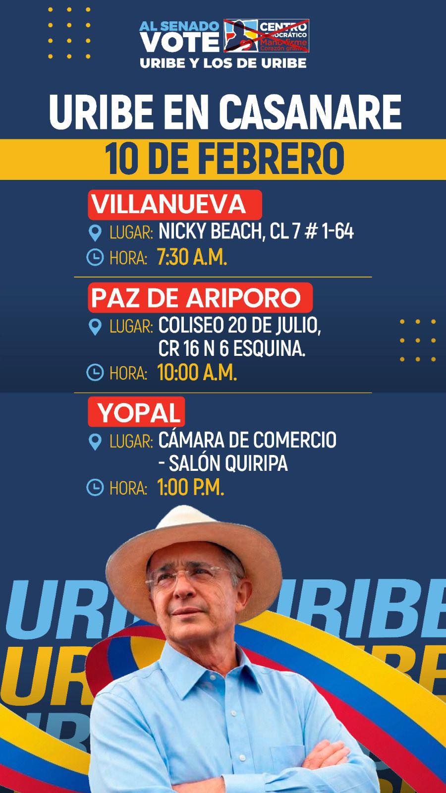 Yopal – Casanare 07-02-2026 – El senador Josué Alirio Barrera Rodríguez confirmó en una rueda de prensa la visita del expresidente de la República y líder del partido Centro Democrático, Álvaro Uribe Vélez, al departamento de Casanare. La agenda está programada para el próximo martes 10 de febrero.Durante su estancia en la región, el expresidente Uribe llevará a cabo un recorrido por varios municipios para dialogar con las comunidades y líderes locales. La jornada dará inicio en el municipio de Villanueva a las 7:30 a. m., continuará en Paz de Ariporo a las 10:00 a. m. y culminará con un encuentro en la capital, Yopal, a la 1:00 p. m.