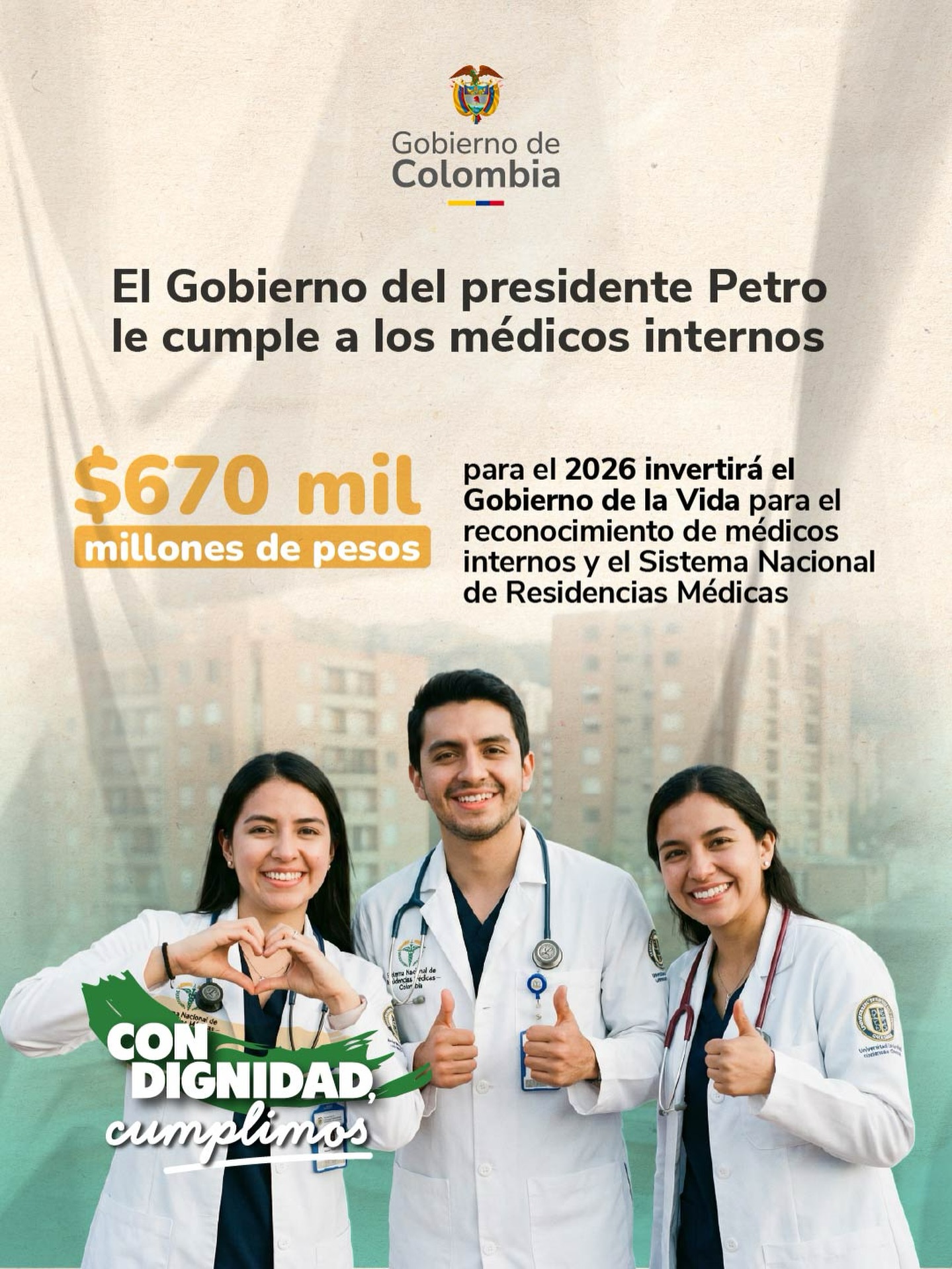 Para la vigencia 2026, el Gobierno Nacional informó que destinará $214 mil millones de pesos para la remuneración de los internos de medicina. Esta inversión se suma a los $456 mil millones de pesos destinados al Sistema Nacional de Residencias Médicas, con lo cual se reporta una inversión total de $670 mil millones de pesos orientada a “fortalecer la formación y dignificación del talento humano en salud”.