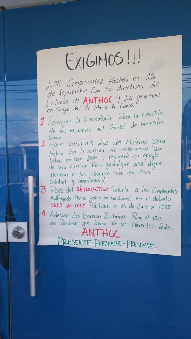- Condiciones laborales: Exigen la adecuación de las baterías sanitarias en las diferentes sedes y solicitan personal de apoyo de enfermería en el centro Materno Infantil para garantizar una atención digna y de calidad a los usuarios.