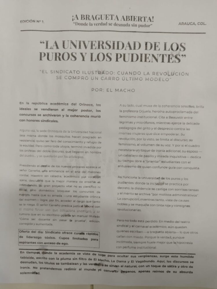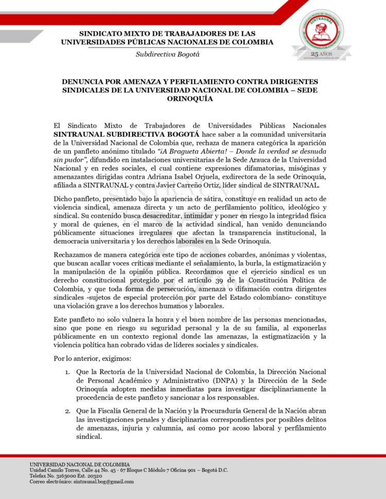 Sus nombres aparecieron en un panfleto anónimo titulado “A Bragueta Abierta” – Donde la verdad se desnuda si pudor, el cual fue difundido en las instalaciones universitarias de la sede Arauca de la Universidad Nacional y las redes sociales, el que contiene expresiones difamatorias, misóginas y amenazantes dirigidas contra los dos líderes sindicales.