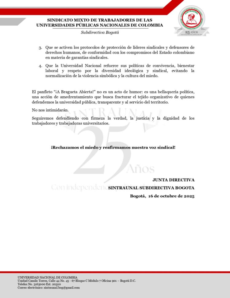 Dicha situación llevó al pronunciamiento del Sindicato Mixto de Trabajadores de las Universidades Públicas Nacionales de Colombia, al considerar que dicho panfleto presentado bajo la apariencia de sátira, constituye en realidad un acto de violencia sindical, amenaza directa y un acto de perfilamiento político, ideológico y sindical.