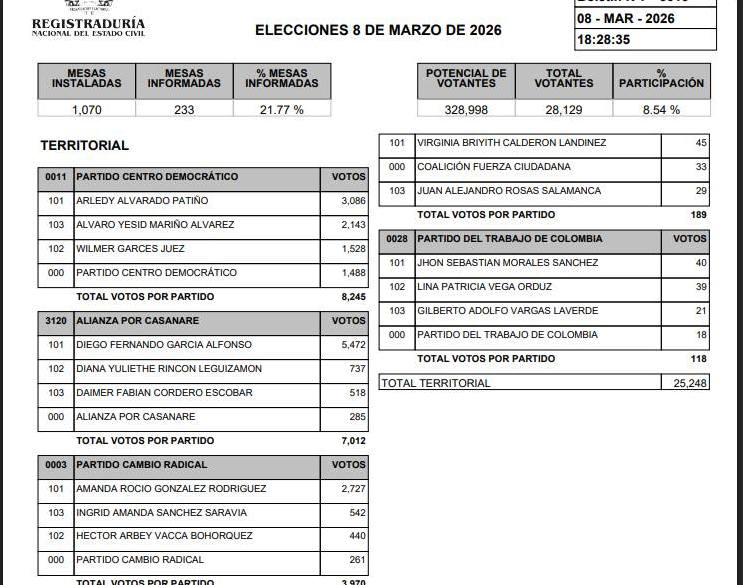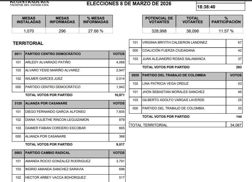 Estos resultados del preconteo reconfiguran el mapa de poder en Casanare, otorgándole a la alianza de centro-verde un mandato claro por parte de los electores. A la espera de la oficialización de las credenciales, las cifras ratifican el apoyo masivo hacia el proyecto político encabezado por García Alfonso.