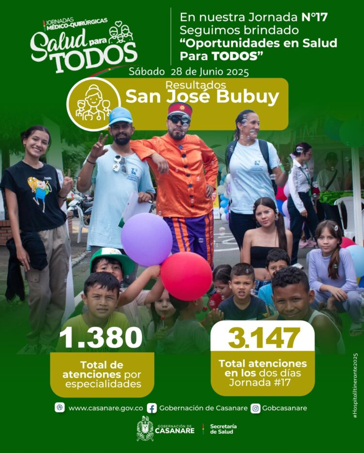 CASANARE – Con un balance de 3,147 atenciones en salud y 52 cirugías exitosas, culminó la jornada médico-quirúrgica número 17, que durante dos días llevó servicios de salud de alta calidad a las comunidades de Aguazul y San José del Bubuy. La iniciativa, centrada en ofrecer atención digna y accesible, representa una nueva esperanza y bienestar para cientos de familias del departamento.