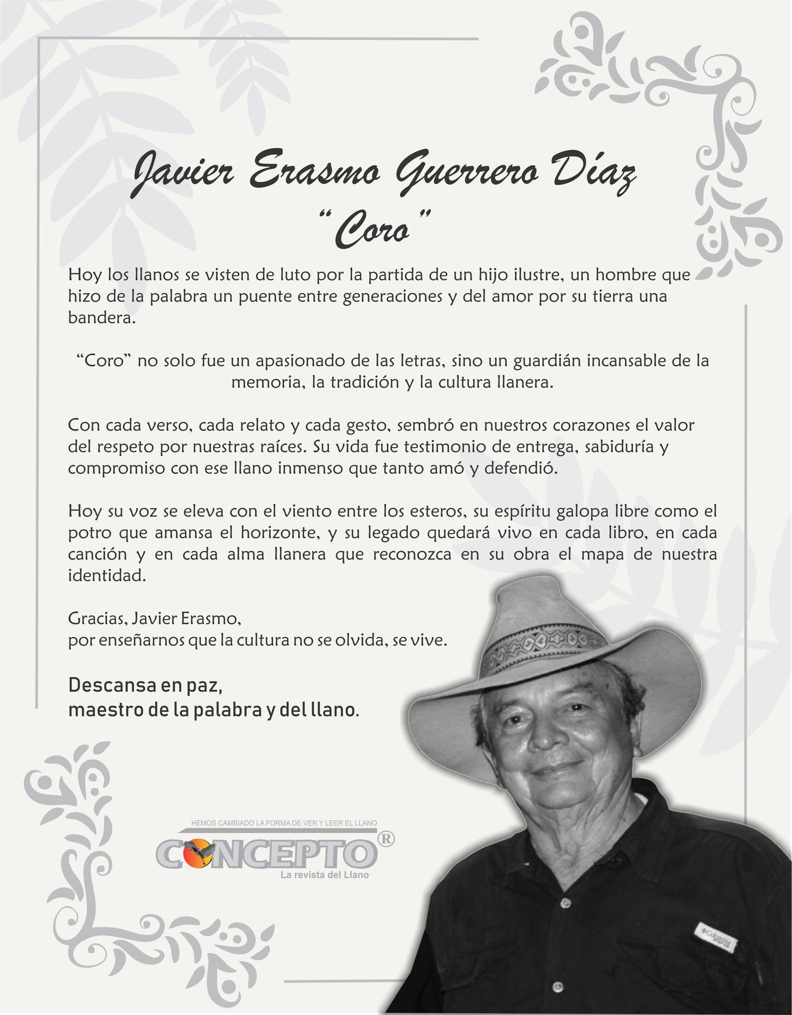 En la noche del jueves 24 de abril, Coro Guerrero, un destacado defensor de las tradiciones llaneras, falleció a causa de una afección cardíaca. A pesar de haber recibido atención médica en la unidad de cuidados intensivos del Hospital San Vicente, un segundo episodio cardíaco le causó la muerte promediando la medianoche.