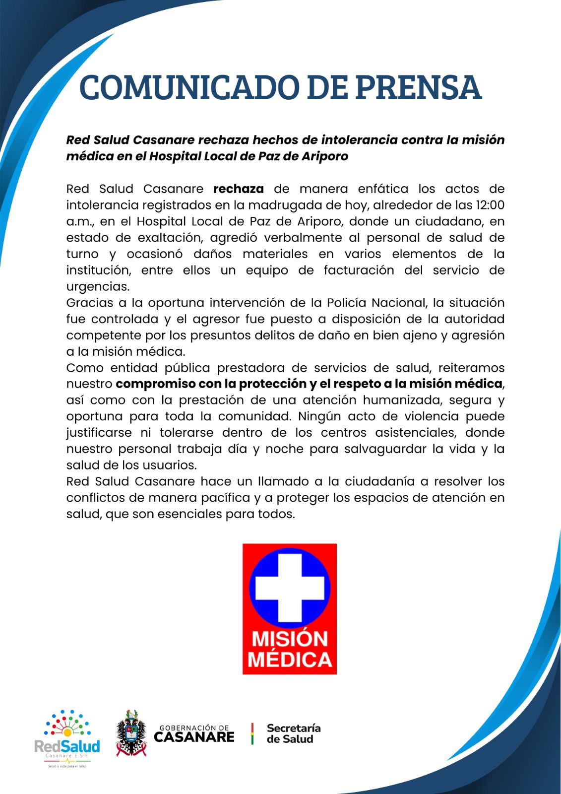La Gobernación de Casanare manifesta su rechazo frente al episodio de violencia ocurrido en la madrugada de hoy en el Hospital de Paz de Ariporo, donde un ciudadano, en evidente exaltación, atacó al personal de salud y causó daños en la infraestructura del centro asistencial.