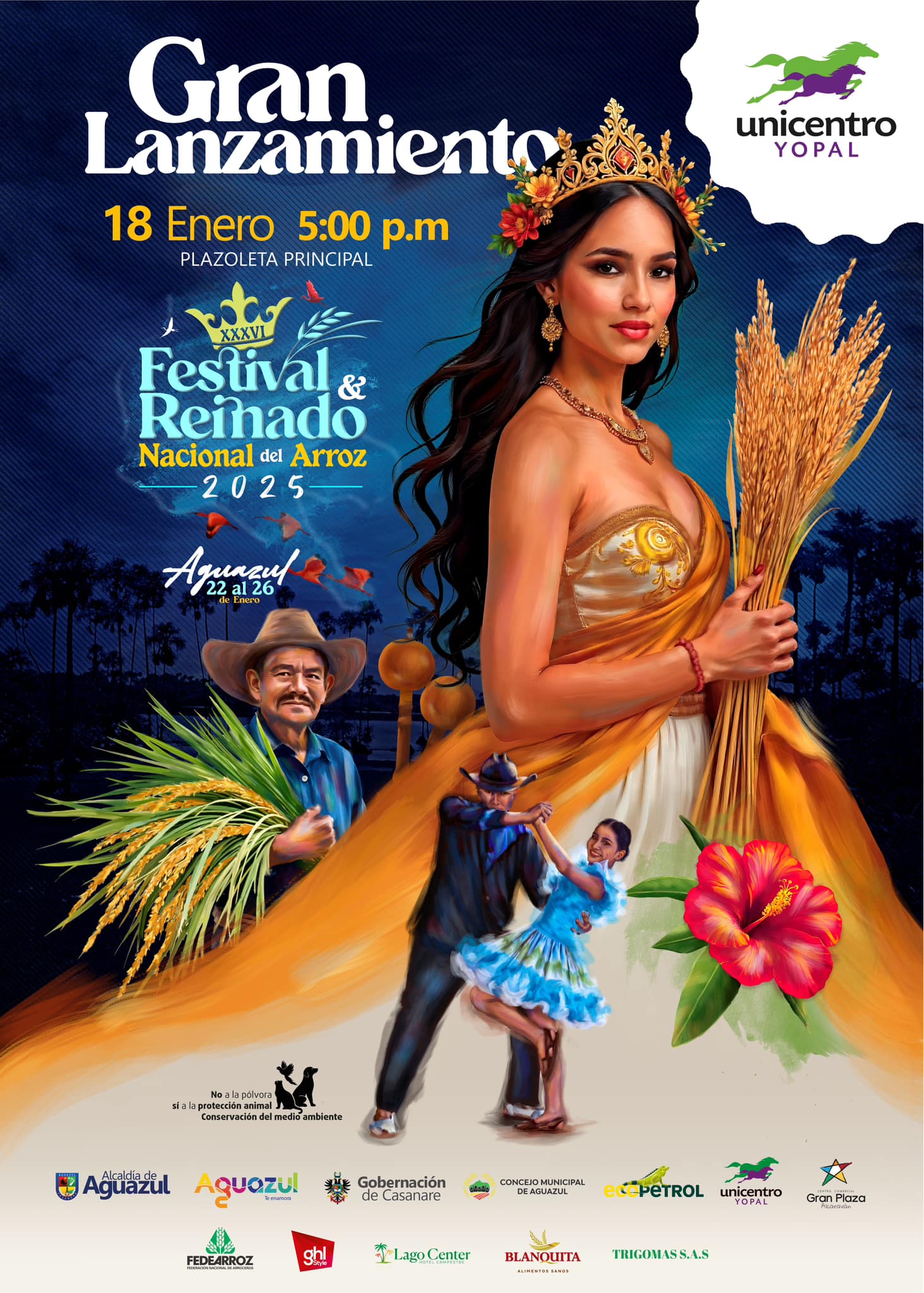 Este sábado 18 de enero a las 5:00 p.m. te invitamos a ser parte del gran lanzamiento del XXXVI Festival y Reinado Nacional del Arroz, que se llevará a cabo en Unicentro Yopal CC. Este evento marca el inicio oficial de la fiesta más emblemática de nuestra región.