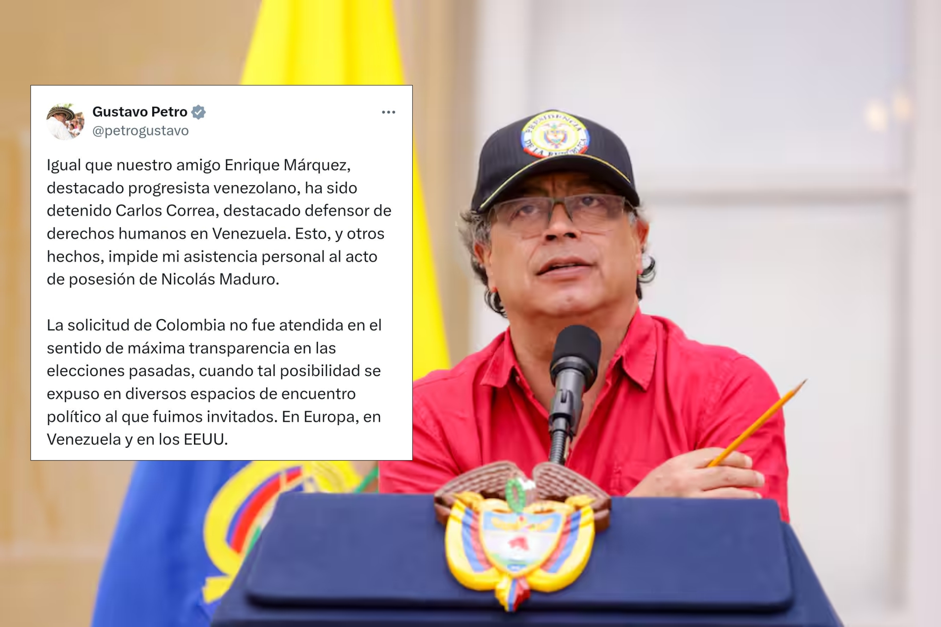 El presidente de Colombia, Gustavo Petro, anunció que no asistirá a la ceremonia de posesión de Nicolás Maduro como presidente de Venezuela. En su lugar, el embajador colombiano en Caracas representará al país en este evento.