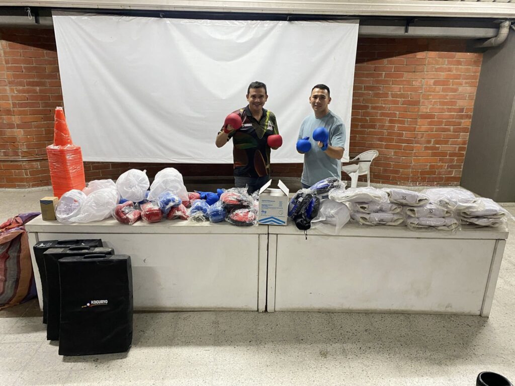La dotación incluye cascos de karate, pecheras, guantes, manoplas, paletas de pato doble, cojín de pecho, balón medicinal, escalera atlética, set de bandas de poliéster y conos, cumpliendo con todas las normativas necesarias para el desarrollo de nuestros deportistas.