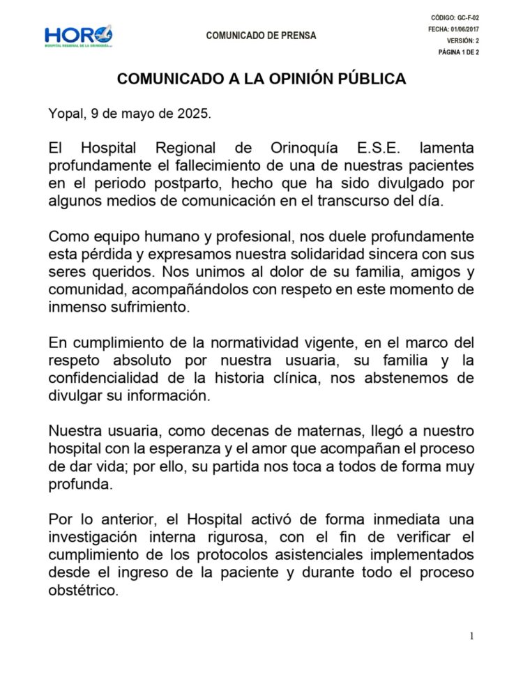 El Hospital Regional de Orinoquía E.S.E. lamenta profundamente el fallecimiento de una de nuestras pacientes en el periodo postparto, hecho que ha sido divulgado por algunos medios de comunicación en el transcurso del día.