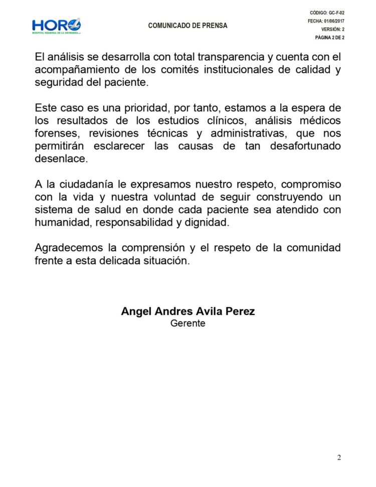 En cumplimiento de la normatividad vigente, en el respeto absoluto por nuestra usuaria, su familia y la confidencialidad de la historia clínica, nos abstenemos de divulgar su información. Nuestra usuaria, como decenas de maternas, llegó a nuestro hospital con la esperanza y el amor que acompañan el proceso de dar vida; por ello, su partida nos toca a todos de forma muy profunda.
