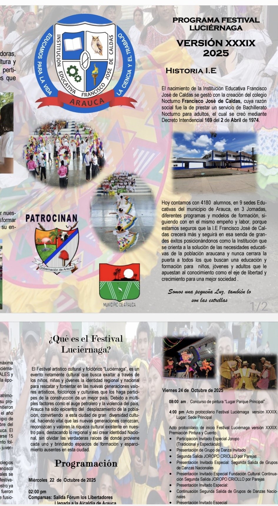 La ciudad de Arauca se llena de cultura y arte con el inicio de la trigésima novena versión del tradicional Festival Luciérnaga, evento que reúne a estudiantes, docentes y comunidad en general alrededor de expresiones artísticas y culturales. Este año, la sede del festival es la Institución Educativa Francisco José de Caldas, donde se desarrollarán múltiples actividades que resaltan el talento y la creatividad local.