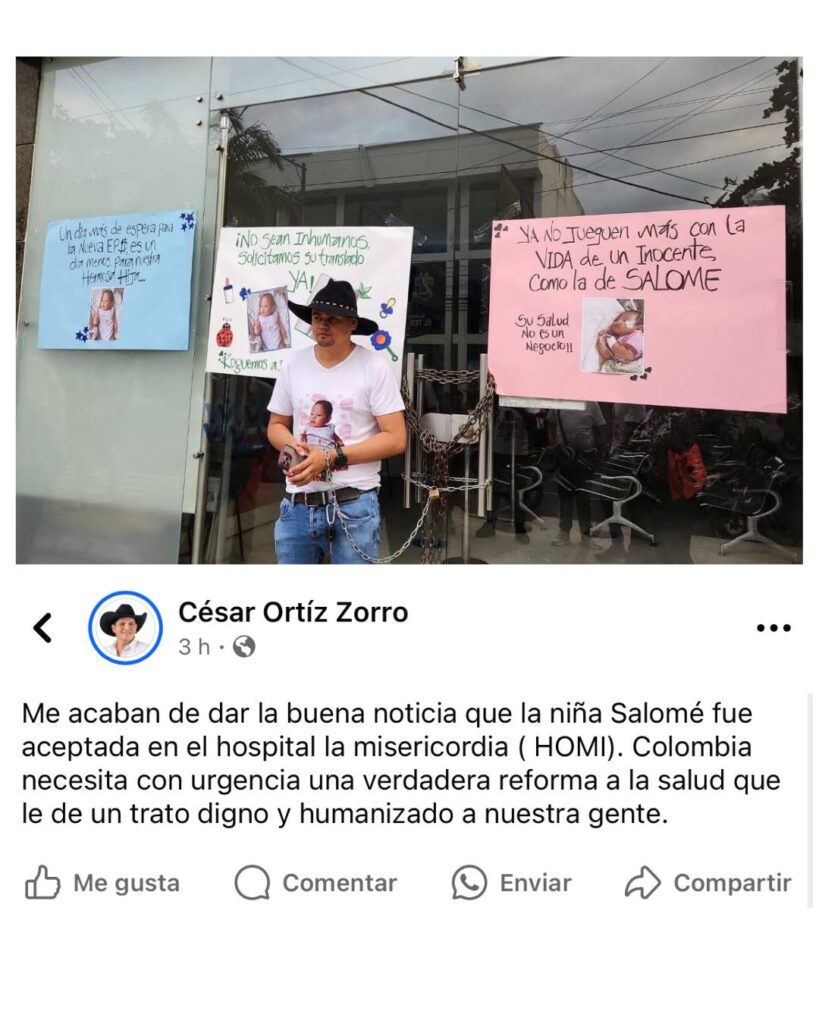 “Me acaban de dar la buena noticia de que la niña Salomé fue aceptada en el Hospital La Misericordia (HOMI)”, informó el mandatario en sus redes sociales. Además, aprovechó la ocasión para insistir en la necesidad de una reforma estructural al sistema de salud en Colombia. “Nuestro país requiere con urgencia una reforma que garantice un trato digno y humanizado a nuestra gente”, afirmó.