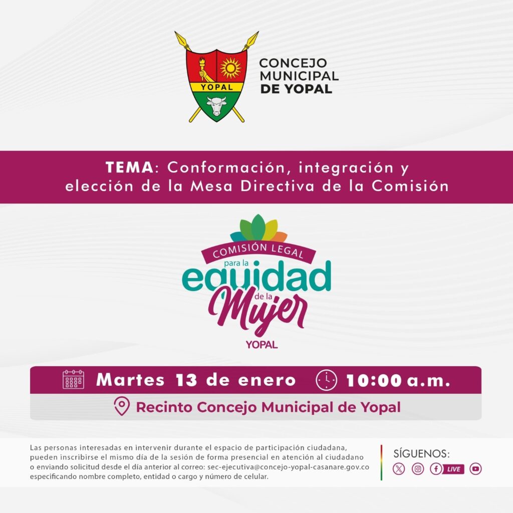 El Concejo Municipal de Yopal se complace en invitar a la comunidad a la primera sesión de la Comisión Legal para la Equidad de la Mujer, donde se llevarán a cabo la conformación, integración y elección de la Mesa Directiva de la Comisión para la vigencia 2026.
