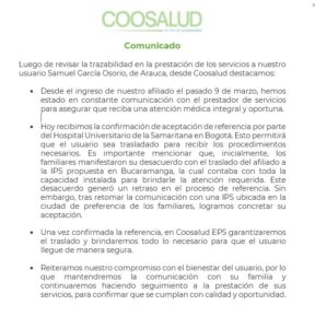 Luego de revisar la trazabilidad en la prestación de los servicios a nuestro usuario Samuel García Osorio, de Arauca, desde Coosalud destacamos: