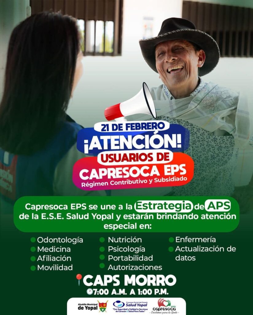El Morro, 20 de febrero de 2025 – Con el objetivo de mejorar el acceso a servicios de salud en la comunidad, Capresoca Eps y la E.S.E. Salud Yopal han unido esfuerzos para implementar la Estrategia de Atención Primaria en Salud (APS) en esta localidad. Este nuevo enfoque permitirá a los usuarios del Régimen Contributivo y Subsidiado acceder a atención médica más cercana a sus hogares.