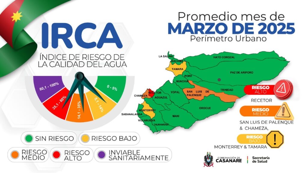 La Secretaría de Salud departamental informa a la comunidad de Casanare que, tras el monitoreo realizado en el mes de marzo de 2025, se ha determinado el índice de riesgo de la calidad del agua en diferentes municipios del departamento, conforme a lo estipulado en la Resolución 2115 de 2007.