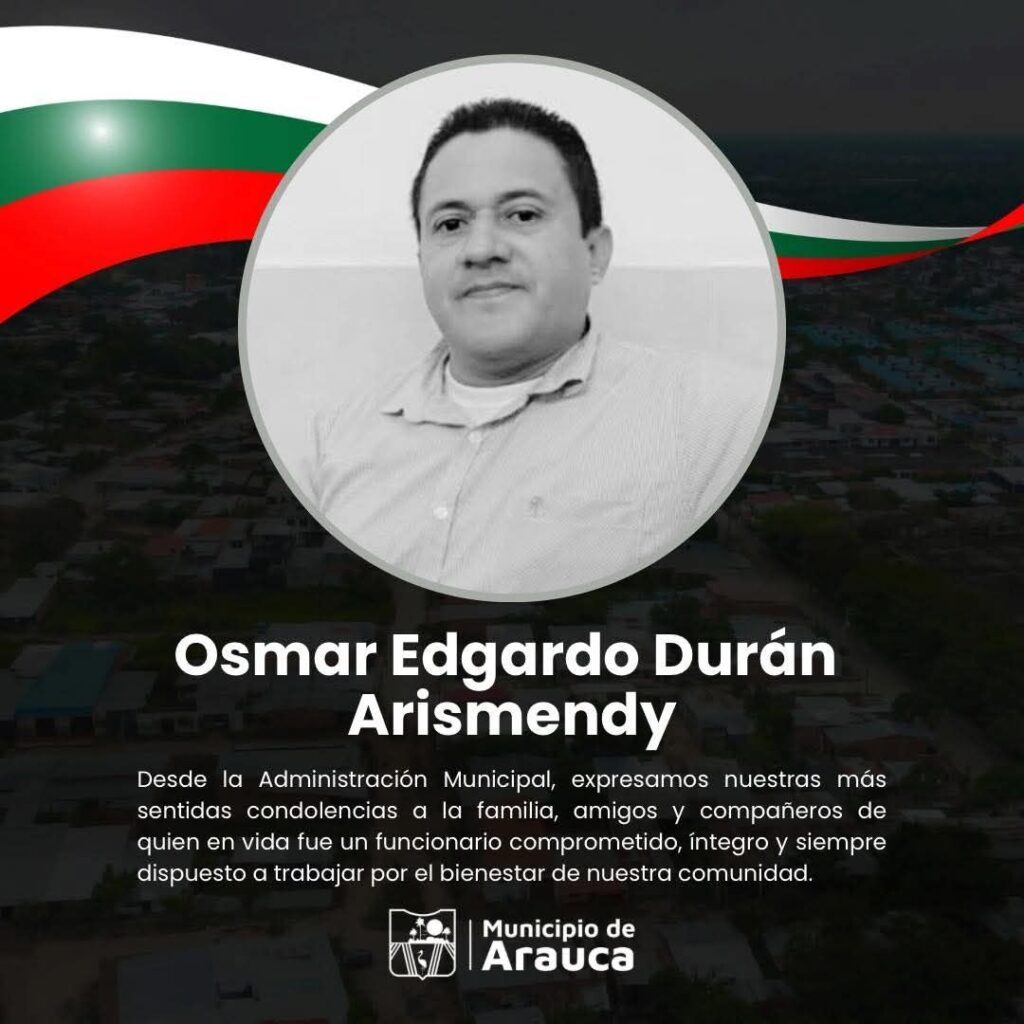 Desde la Alcaldía de Arauca expresamos nuestro profundo pesar por el fallecimiento de Osmar Edgardo Durán Arismendy, un valioso funcionario que con compromiso y vocación de servicio aportó al desarrollo de nuestro municipio.