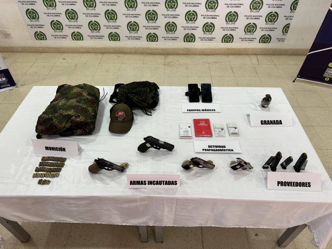 Durante la operación, las autoridades también lograron incautar cuatro pistolas, una granada de mano, cuatro proveedores para pistola y 119 cartuchos de diferentes calibres, además de panfletos y material relacionado con el ELN. Todo el material fue puesto a disposición de las autoridades judiciales.
