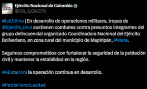 En una operación militar en curso, tropas del Ejército Nacional de Colombia, adscritas a la Cuarta División, se enfrentan a presuntos miembros de la Coordinadora Nacional del Ejército Bolivariano en una zona rural del municipio de Mapiripán, en el departamento del Meta.