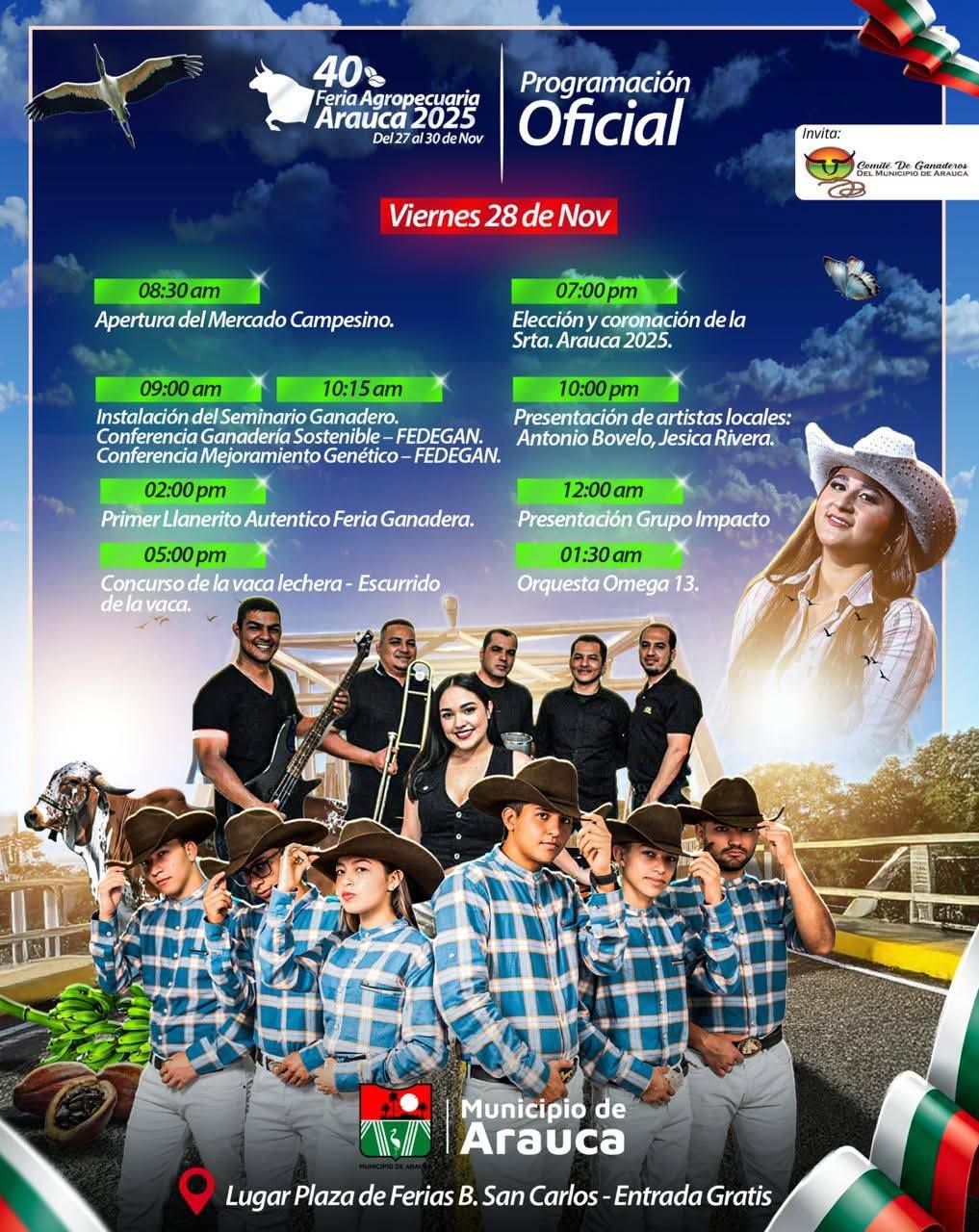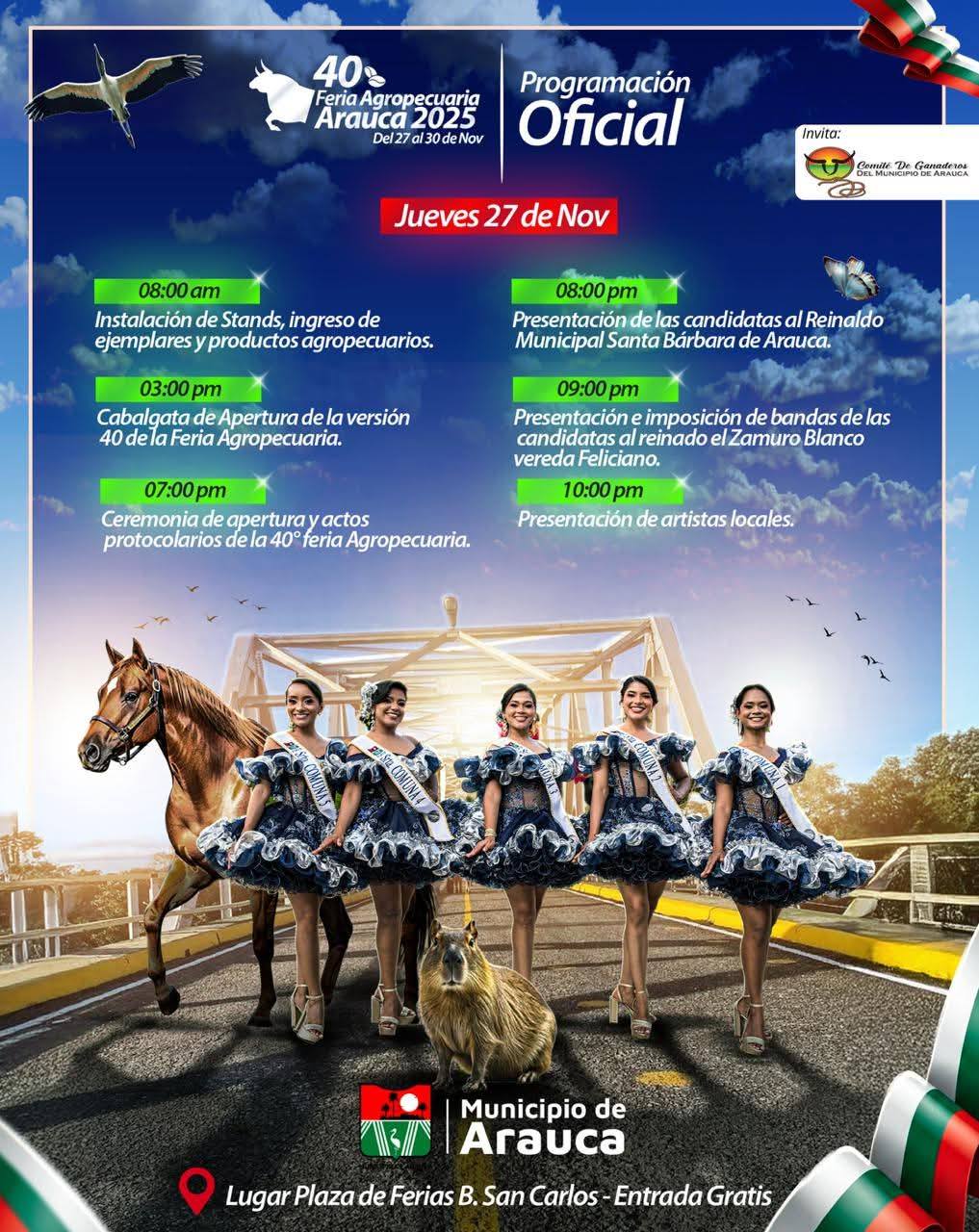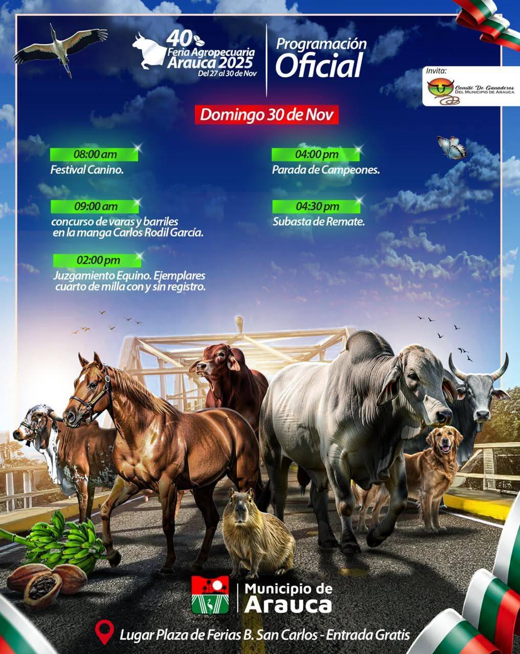 Del 27 al 30 de noviembre, Arauca será el escenario de la 40ª versión de su emblemática Feria Agropecuaria, un evento que promete resaltar lo mejor de la producción agropecuaria y cultural de la región. Invitamos a todos a disfrutar de una variada programación que incluye cabalgatas, subastas ganaderas y exposiciones bovinas y equinas.
