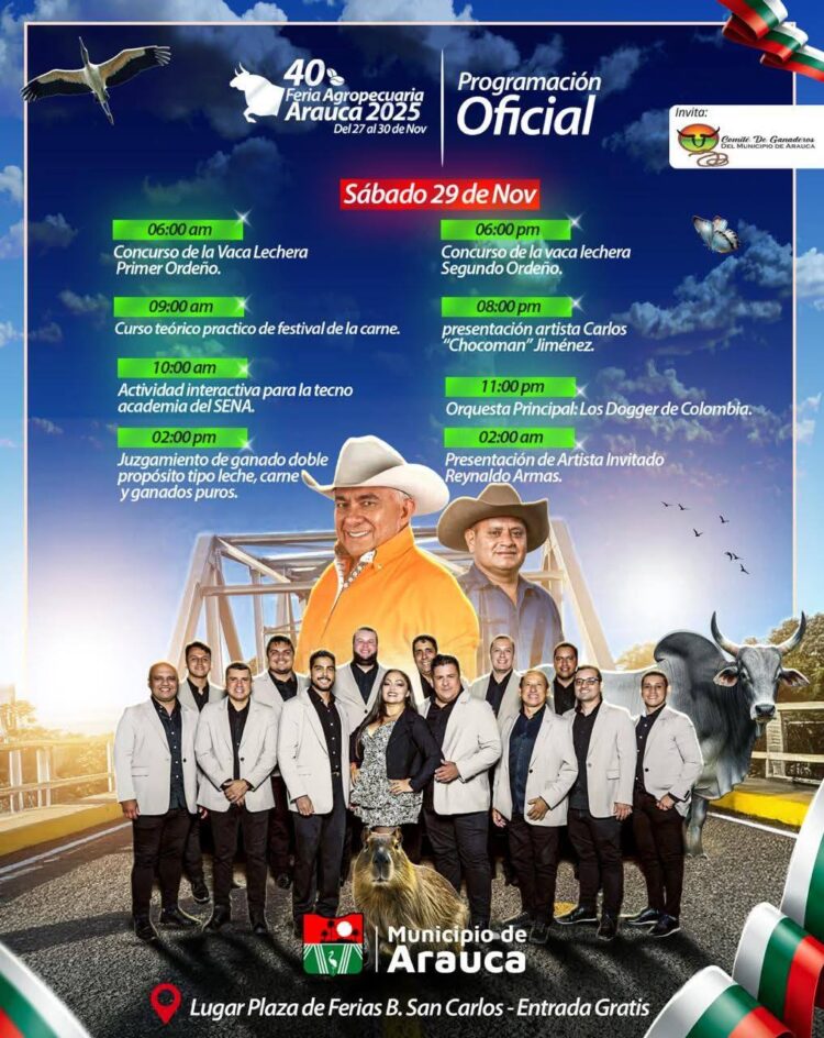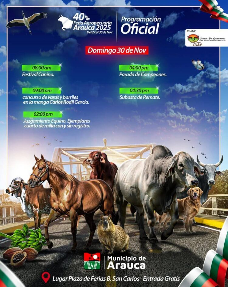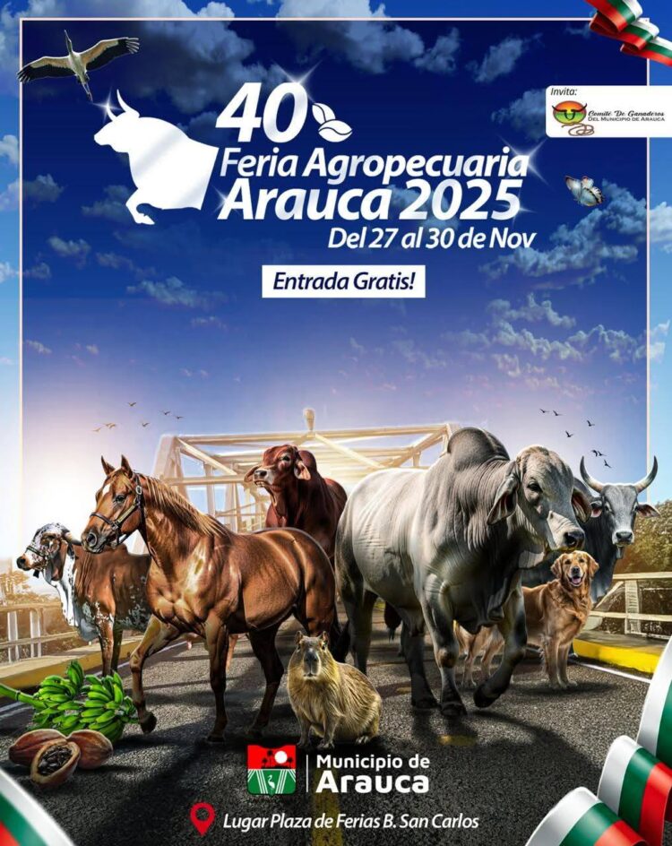 Del 27 al 30 de noviembre, Arauca será el escenario de la 40ª versión de su emblemática Feria Agropecuaria, un evento que promete resaltar lo mejor de la producción agropecuaria y cultural de la región. Invitamos a todos a disfrutar de una variada programación que incluye cabalgatas, subastas ganaderas y exposiciones bovinas y equinas.