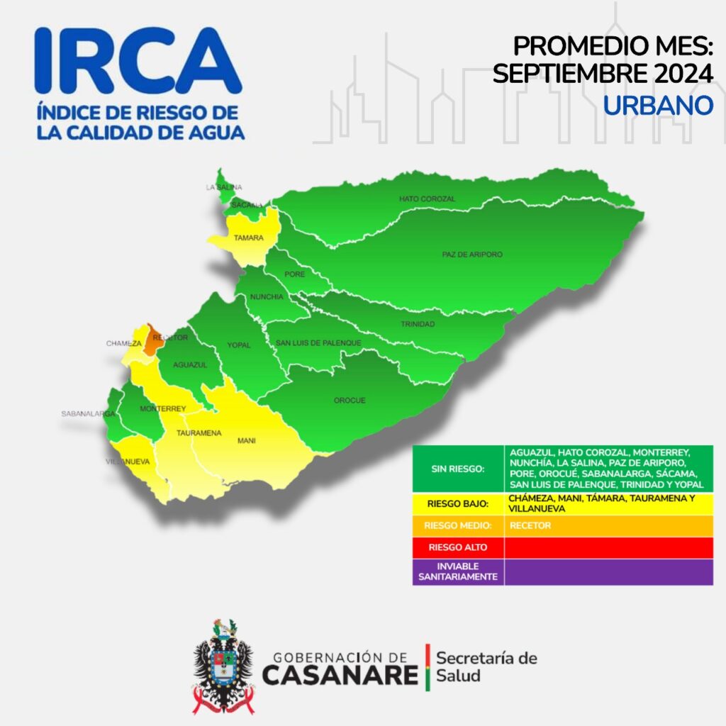 resultados del monitoreo al índice de Riesgo de la Calidad de Agua (IRCA) para las áreas urbanas de Casanare, en los que se tuvo en cuenta información recolectada en el mes de SEPTIEMBRE del año 2024.