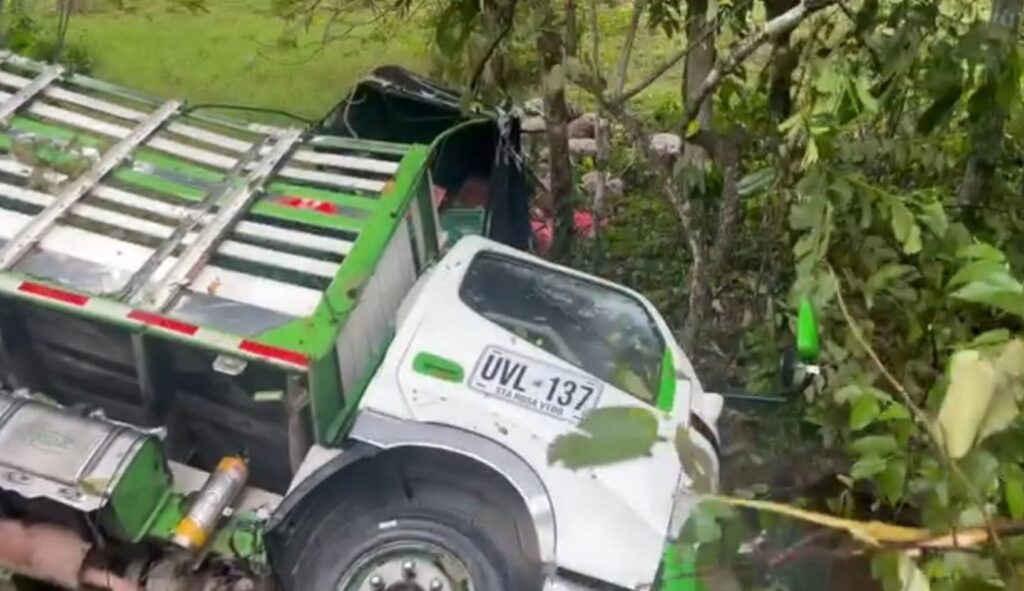 El vehículo de carga de placas UVL-137 de Santa Rosa de Viterbo, terminó rodando a orilla de carretera, al lado de la infraestructura de una alcantarilla, registrando daños significativos y pérdidas en la mercancía que transportaba.