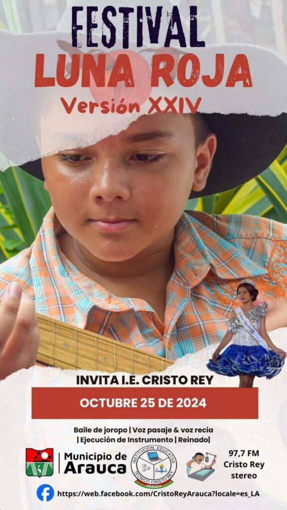La Institución Educativa Cristo Rey de Arauca te invita a vivir una nueva versión de nuestro tradicional Festival Luna Roja, este 25 de octubre, donde celebraremos con orgullo lo mejor del folclor llanero.