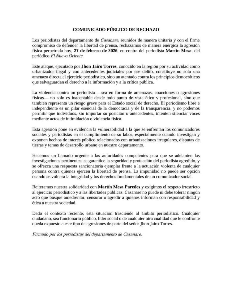 Los periodistas del departamento de Casanare, reunidos en un acto unitario y con el firme compromiso de defender la libertad de prensa, expresamos nuestro rechazo contundente a esta agresión física, perpetrada el 27 de febrero de 2026, hacia el periodista Martín Mesa.