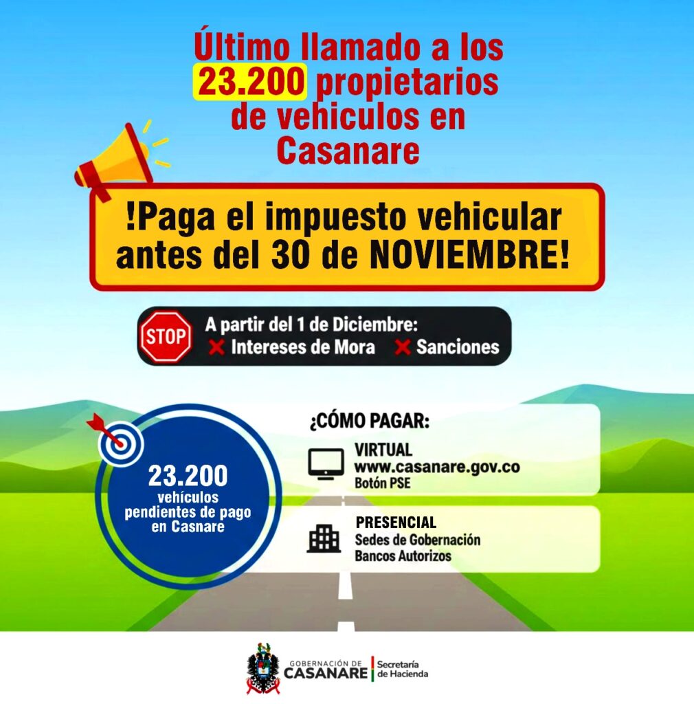 La Secretaría de Hacienda invita con carácter urgente a los propietarios de vehículos matriculados en el departamento a realizar el pago del Impuesto Vehicular antes del 30 de noviembre. Según el registro actual, 23.200 contribuyentes aún no han cumplido con esta obligación fiscal.