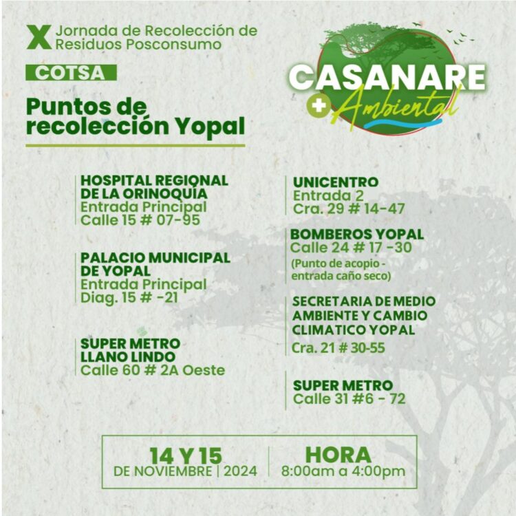 Del 14 al 16 de noviembre se invita a toda la ciudadanía en Casanare a participar de la gran jornada de recolección residuos especiales dirigida a promover la gestión ambientalmente adecuada de los residuos especiales como: residuos de aparatos eléctricos y electrónicos, luminarias, pilas y acumuladores usados, electrodomésticos, tóner y cartuchos, computadores y periféricos, baterías de carros y motos, aceite usados de cocina, medicamentos usados vencidos, medicamentos veterinarios vencidos, plaguicidas de uso agropecuarios, plaguicidas de uso domésticos, plaguicidas de uso en mascotas, envases y empaques aprovechables.