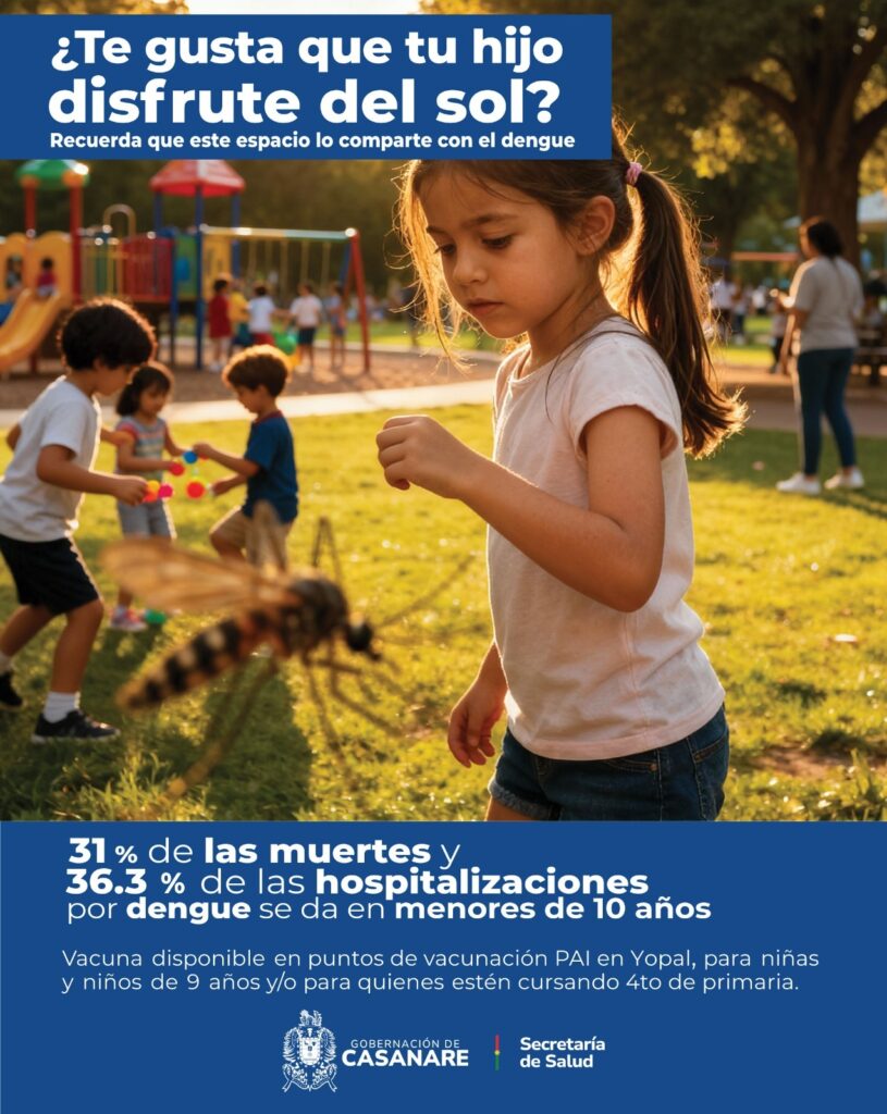 El dengue continúa afectando a las familias en Casanare y puede generar complicaciones graves en la salud. Ante esta situación, en Yopal avanza el Plan Escalonado de Vacunación contra el dengue, una estrategia liderada por el Ministerio de Salud y Protección Social y la Secretaría de Salud de la Gobernación de Casanare, orientada a proteger a los niños y niñas de 9 años o que cursan cuarto grado de primaria, mediante vacunación gratuita.