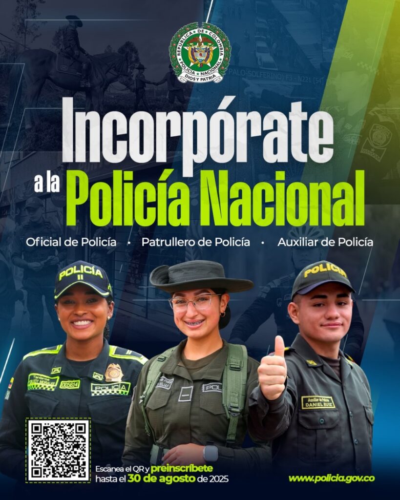 Los interesados en formar parte de esta fuerza de seguridad pueden realizar su preinscripción a través del portal oficial www.policia.gov.co/incorporate-policia-nacional, bajo el llamado a “servir con honor, proteger con valor y transformar su historia”